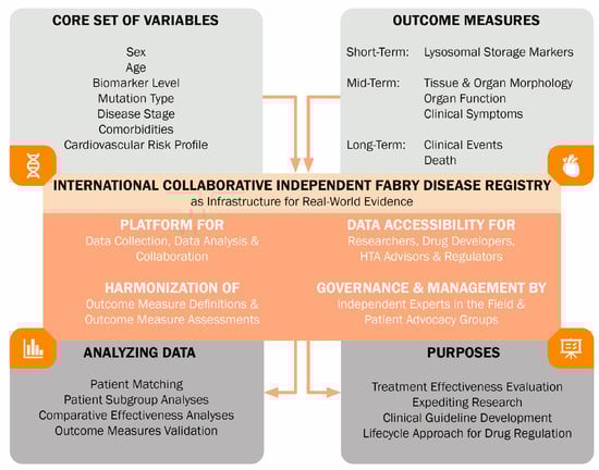 The infrastructure for enhancing therapeutic development and evaluation in FD may be provided by an international FD registry (Figure 2). This disease-centered registry could facilitate international collaboration and high-quality harmonized data collection for research, drug development, and regulatory and reimbursement decision-making. Industry-independent governance should be established, and data should be accessible to different stakeholders. The registry should contain a large number and variety of patients. A core set of variables should be identified in a collaborative multi-stakeholder effort []. These variables should be well-defined in terms of measurement method, relevant patient group, and way of registration. Capturing important baseline characteristics that serve as prognostic factors, as well as information on potential confounding factors, including supportive therapies, is essential. Long-term follow-up will provide real-world data on the long-term (comparative) effectiveness of treatments. This registry can also be used to validate surrogate outcome parameters and capture natural history data, especially important in patients with milder phenotypes who are increasingly being diagnosed. Collaborative efforts also expedite research sample collection, enabling studies on novel (bio)markers.