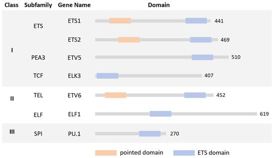 The E26 transformation-specific (ETS) family is highly evolutionarily conserved [3]. The ETS family consists of 28 genes in humans, while it consists of 27 genes in mice [4]. Based on the differences in sequences and sequence preferences, the ETS family is divided into four classes and 12 subfamilies [5,6,7,8]. The ETS family is involved in a variety of physiological processes, including embryonic development, cell cycle, differentiation, proliferation, apoptosis, migration, and secretion [9,10,11,12,13,14]. In recent years, much attention has been focused on the role of the ETS family in the development and differentiation of immune cells.