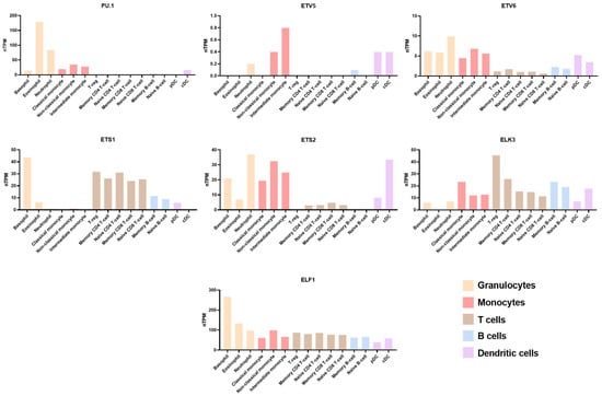 The expression of ETS transcription factors in immune cells. PU.1 available from https://www.proteinatlas.org/ENSG00000066336-SPI1/immune+cell. ETV5 available from https://www.proteinatlas.org/ENSG00000244405-ETV5/immune+cell. ETV6 available from https://www.proteinatlas.org/ENSG00000139083-ETV6/immune+cell. ETS1 available from https://www.proteinatlas.org/ENSG00000134954-ETS1/immune+cell. ETS2 available from https://www.proteinatlas.org/ENSG00000157557-ETS2/immune+cell. ELK3 available from https://www.proteinatlas.org/ENSG00000111145-ELK3/immune+cell. ELF1 available from https://www.proteinatlas.org/ENSG00000120690-ELF1/immune+cell (all accessed on 14 September 2024).