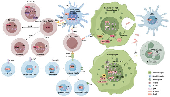ETS family in immune cells. In Th17 cells, STAT3 directly binds to the ETV5 promoter to activate the expression of ETV5. ETV5 directly facilitates the expression of IL-17a and IL-17f. In Th2 cells, EVT5 promotes the production of IL-10. In Th1 cells, ETV5 enhances the level of IFN-γ. In Th9 cells, ETV5 and PU.1 promote the production of IL-9. PU.1 regulates early B-cell development and differentiation. In macrophages, ELK3 inhibits the expression of NOS2 and HO-1. ETS2 inhibits the expression of IL-6. Phosphorylated PU.1 initiates transcription of COX2 and ROS. LPS induces the formation of a complex between PU.1 and c-Jun promoting transcription. In bacteria-infected macrophages, PU.1 and ETS2 significantly enhance the activation of BCL-x. CRL4 targets the ETV5, which is degraded by the ubiquitin–proteasome system. In neutrophils, PU.1 activates the transcription of MRP1S and DAPK2. PU.1 also promotes neutrophil nuclear division by regulating the transcription of LBR. In cDCs, PU.1 activates the transcription of CCR7, CD11c, OX40L, DC-SIGN, and CIITA pI and forms a heterodimer with IRF8 promoting CIITA pI expression. In pDCs, PU.1 activates pIII by directly binding to the CIITA pIII promoter. Scheme 1. HO-1; Cyclooxygenase 2, COX2; Reactive oxygen species, ROS; Lipopolysaccharides, LPS; B-cell lymphoma, BCL; Cullin-RING E3 ubiquitin ligases, CRL4; Microtubule-associated protein 1S, MRP1S; Death-associated protein kinase 2, DAPK2; Laminin B receptor, LBR; Conventional DC, cDC; Plasmacytoid dendritic, pDC; C-C Motif Chemokine Receptor 7, CCR7; OX40 ligand, OX40L; Dendritic cell-specific ICAM-grabbing non-integrin, DC-SIGN; Interferon regulatory factor 8, IRF8; Class II trans-activator, CIITA.