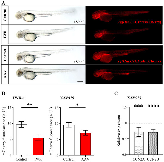 IWR-1 and XAV939-mediated β-catenin pathway inhibition reduces Tg(Hsa.CTGF:nlsmCherry)ia49 reporter signal. (A,B) Tg(Hsa.CTGF:nlsmCherry)ia49 embryos were exposed to IWR-1 or XAV939 for 24 h, and the fluorescent reporter expression was documented (A) and quantified at the level of the whole embryo (B) at 48 hpf. mCherry fluorescence levels (B) were analyzed by measuring the integrated density with FIJI software Control IWR (n = 27), IWR treated embryos (n = 28); Control XAW (n = 31), XAW treated embryos (n = 34). (C) Relative expression of ccn2a and ccn2b genes in zebrafish embryos after treatment with XAV939 from 24 to 48 hpf. mRNA levels were normalized to the DMSO-treated controls (dashed line). Scale bar 250 μm Data are presented as mean +/− SEM (Mann−Whitney test (B), Student t-test (C); * p < 0.05, ** p < 0.01, *** p < 0.001, **** p < 0.0001).