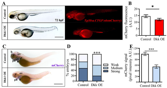 Wnt/β-catenin pathway inhibition through Dkk1 overexpression reduces Tg(Hsa.CTGF:nlsmCherry)ia49 transgene expression. (A) Tg(Hsa.CTGF:nlsmCherry)ia49 fish were outcrossed with the Tg(hsp70:dkk1-GFP)w32 line, and the offspring was heat shocked to induce the overexpression of the Wnt antagonist Dkk1 (Dkk1 OE). Representative images of a double transgenic embryo (Dkk1 OE) at 72 hpf after Dkk1 overexpression compared to WT control siblings (control). (B) mCherry quantification on the entire embryo showed only a modest but significant decrease of fluorescence intensity in Tg(hsp70:dkk1-GFP)w32 larvae after Dkk1 activation; Control (n = 84), Dkk OE (n = 87). (C) In-situ hybridization performed with an antisense probe against mCherry transcript revealed a significant reduction of mCherry mRNA levels after Dkk1 overexpression, compared to the control siblings. The decrease in mCherry mRNA levels is evident in the brain (b), eyes (e), otic vesicle (ov), heart (h), and pharyngeal arches (ph). (D,E) The variation in the in situ hybridization signal intensity was quantified using two independent systems. In (D), the analysis was performed by manually categorizing the embryos of the control and experimental samples (Dkk1 OE) into distinct groups based on the observed signal strength (strong, medium, and weak) at the whole embryo level. In (E), the mCherry signals in each sample (head region) were quantified using the Volocity 6.0 software. Control (n = 321), Dkk OE (n = 288). Scale bar 500 μm. In (B,E), data are presented as mean +/− SEM (Mann−Whitney test); * p < 0.05, *** p < 0.001).