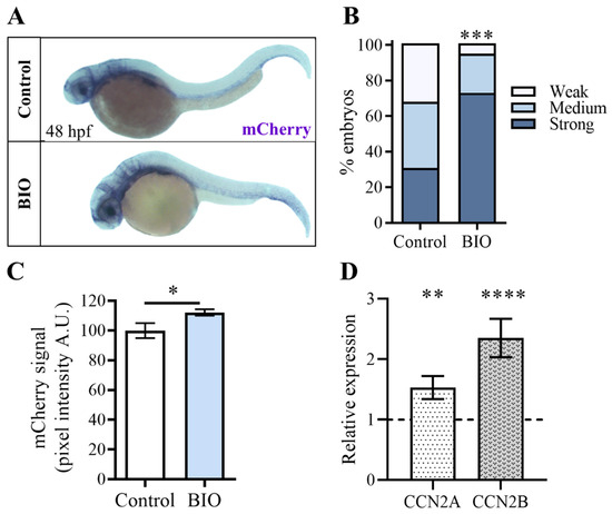Pharmacological inhibition of β-catenin kinase GSK3 increases Tg(Hsa.CTGF:nlsmCherry)ia49 reporter signal. (A) Tg(Hsa.CTGF:nlsmCherry)ia49 embryos were exposed to BIO from 24 to 48 hpf, and after fixation, the mCherry transgene expression was assessed by in situ hybridization. (B,C) The embryos treated with BIO showed higher levels of mRNA mCherry transgene expression compared to their untreated control siblings. In the in situ hybridization experiments, the signal intensity variation was assessed using two different methods. In (B), the analysis was performed by grouping the embryos into three distinct classes based on the observed signal strength at the whole embryo level. In (C), the mCherry signals were quantified by measuring the pixel intensity in the head region, using Volocity 6.0 software. Control (n = 52), BIO (n = 51). (D) In 48 hpf zebrafish embryos, the expression of ccn2a and ccn2b genes was strongly up-regulated after treatment with BIO for 24 h. mRNA levels were normalized to the DMSO-treated controls (dashed line). Scale bar: 250 μm. In (C,D), data are presented as mean +/− SEM (Mann−Whitney test in (C) and Student t-test in (D); * p < 0.05, ** p < 0.01, *** p < 0.001, **** p < 0.0001).