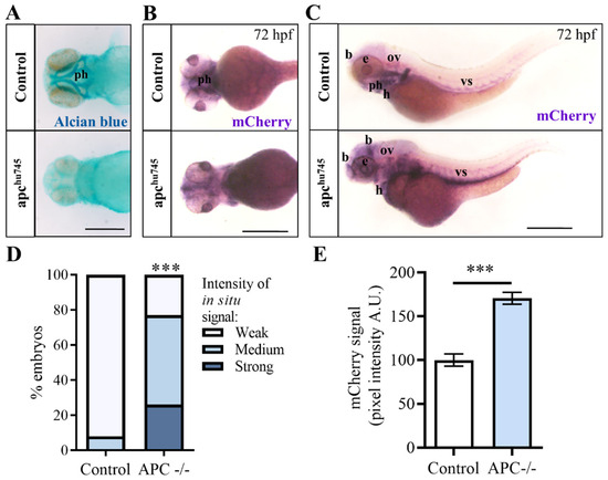 Tg(Hsa.CTGF:nlsmCherry)ia49 reporter activity is increased in apc mutant background at 72 hpf. (A) apchu745 mutants fail to develop the cartilage structure, as evidenced by the alcian blue staining. (B) The reporter signal, labeling the pharyngeal arches (ph), disappears in apchu745 mutant background due to the lack of these structures, as shown by the in situ hybridization against mCherry mRNA as well. (C) In situ hybridization for mCherry displaying the general upregulation of Yap/Taz reporter activity in apchu745 mutant background. The increase in mCherry mRNA levels is evident in the brain (b), eyes (e), otic vesicle (ov), heart (h), and vascular system (vs) along the yolk extension. (D,E) Quantification of the in-situ hybridization experiments was performed (D) by grouping the embryos into three distinct classes according to the observed signal strength at the whole-embryo level, or (E) by measuring the pixel intensity in the head region of each sample using Volocity 6.0 software. Control (n = 48), APC−/− (n = 39). In (E), data are presented as mean +/− SEM (Mann−Whitney test). Scale bar: 500 μm; *** p < 0.001.
