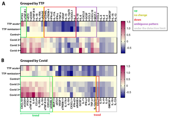Soluble mediator profiles of TTP and COVID-19. The same ratios of the logarithmically transformed median concentration values of the 33 SMs relative to control were plotted twice, each time using a different grouping method for better understanding. In (A), the SMs are grouped based on their changes in TTP (for further details, see Section 2.2 of the Results section), whereas in (B), they are grouped according to their changes in COVID-19 (ordered according to decreasing value of Covid median/control median in each group), as determined by statistical tests (see Table S4). Green boxes indicate elevated SM levels compared to control, red boxes signify decreased levels, yellow boxes represent no change, gray boxes show SMs below the detection limit in TTP (A) or COVID-19 (B), and the purple box indicates an ambiguous pattern.