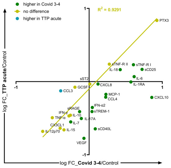 Comparison of soluble mediator profiles of acute TTP and severe COVID-19. For the comparison of the cytokine profiles of acute TTP and COVID-19, the Covid 3 and Covid 4 groups were combined (Covid 3–4), and referred to as severe Covid. The logarithmically transformed fold change (FC) values (acute TTP-to-control ratio and Covid 3–4-to-control ratio) of the 33 SMs were plotted. SMs higher in Covid 3–4 than in acute TTP are plotted in green, those higher in acute TTP are in blue, and those with no significant difference are in yellow, based on Mann–Whitney tests. Simple linear regression for the SMs with no significant difference between the two disease groups is plotted.