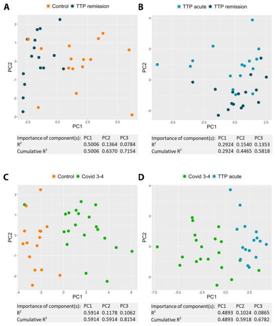 Principal component analysis. Principal component analysis was performed on z-scores of concentrations, based on soluble mediators (SMs) which were significantly altered between the control and TTP remission (A), TTP acute and TTP remission (B), control and Covid 3–4 (C), and Covid 3–4 and TTP acute (D) groups. Three principal components (PCs) were calculated (and their R2 values were plotted), of which the first two were visualized. The importance values of the SMs in each PC are shown in Table S5.