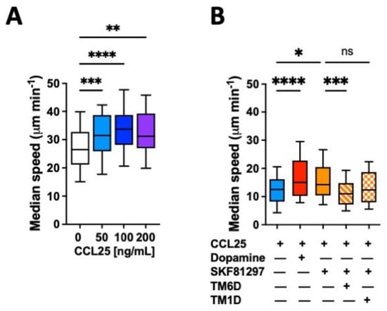 The migratory ability of leukocytes in 3D tissues is highly related to the migratory speed in confined microchannels [,]. To evaluate whether the gut tropism given by the CCR9:DRD5 heteromer to CD4+ T-cells is associated with a higher migratory ability induced by the dual stimulation of this heteromer, we conducted in vitro migration assays using confined microchannels. To this end, we first determined the migratory speed of primary CD4+ T-cells in 3 μm width microchannels in response to increasing concentrations of CCL25. The range of concentrations used in these experiments was chosen based on the range of CCL25 able to trigger a significant reduction in cAMP levels []. The results show that 50 ng/mL CCL25 already induced a significant increase in the migratory speed compared to the base migratory speed (Figure 1A). Next, we determined how was the migratory speed affected when dual stimulation of the heteromer was exerted. The results showed that either dopamine or the DRD5 agonist SKF81297 potentiated the migratory speed of primary CD4+ T-cells (Figure 1B). To address whether the speed potentiation observed in CD4+ T-cells when stimulated with CCR9 and DRD5 agonist was actually triggered by the CCR9:DRD5 heteromer, and not due to the individual stimulation of CCR9 and DRD5, we treated T-cells with a peptide able to disassemble the heteromeric receptor (TM6D) or with a control peptide (TM1D). Of note, these peptides were chosen on the basis of our previous results using a bimolecular complementation assay in which a T-cell line was transfected with the DRD5-nVenus and CCR9-cVenus fusion proteins, and then the ability of α-helix peptides analogue to TM segments from CCR9 and DRD5 to decrease the fluorescence associated with venus was determined []. The results show that, indeed, the speed potentiation exerted by CCL25 and SKF81297 was abrogated when the heteromer was disassembled (by TM6D), but not in the control situation (in the presence of TM1D) (Figure 1B). Thereby, these results represent causal evidence indicating that the dual simulation of the CCR9:DRD5 heteromer on CD4+ T-cells potentiates the migratory speed in confined microchannels.