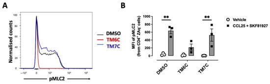 Myosin IIA has been described to play a key role in optimizing the motility rate of T-cells in 3D confined microenvironments in vivo and in vitro []. To evaluate whether the signalling triggered by the CCR9:DRD5 heteromer is related to the activation of Myosin IIA, we next evaluated the phosphorylation of myosin light chain 2 (pMLC2) in CD4+ T-cells under the dual stimulation of CCR9 and DRD5. Indeed, the stimulation of T-cells with CCL25 and SKF81927 induced a high degree of phosphorylation of this protein (Figure 2A,B). Importantly, the pre-treatment of T-cells with the TM6C peptide, which disrupted the assembly of CCR9 with DRD5, strongly reduced the extent of pMLC2. Conversely, the pre-treatment of CD4+ T-cells with the peptide TM7C, which is irrelevant for CCR9:DRD5 assembly, did not affect the degree of pMLC2 induced by CCL25 and SKF81927 (Figure 2A,B). Thus, these results indicate that the dual stimulation of the CCR9:DRD5 heteromer triggers the activation of myosin IIA, which is essential for optimizing the migration of T-cells in vivo.