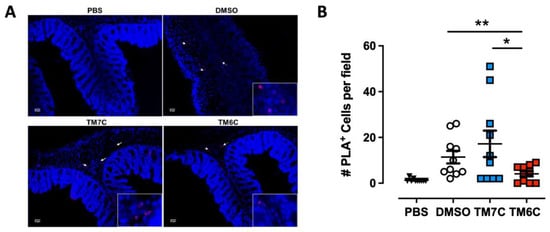 Our previous study revealed a higher degree of lymphocytes expressing the CCR9:DRD5 heteromer in the inflamed colonic mucosa compared with healthy mucosa in human and animal models []. Due to the important role of the CCR9:DRD5 heteromer in triggering the activation of myosin IIA (Figure 2) and optimising the migratory ability of T-cells in confined microenvironments (Figure 1), we hypothesized that disassembling the CCR9:DRD5 heteromer should impair the recruitment of T-cells into the colonic mucosa upon inflammation in vivo. To address this possibility, we determined the infiltration rate of T-cells expressing the CCR9:DRD5 heteromer into the inflamed colonic mucosa when the heteromer formation was disrupted by the TM6C peptide compared with a control peptide that does not affect the heteromer assembly (TM7C). Accordingly, after imprinting gut tropism in CD4+ T-cells, they were treated with the experimental peptides (TM6C, TM7C, or vehicle) and then i.v. transferred into Drd5−/− recipient mice undergoing DSS-induced colitis. Three days later, the extent of heteromer+ cells was quantified in the colonic mucosa via in situ PLA assay. The results show a lower extent of heteromer+ T-cells reaching the colonic mucosa when the CCR9:DRD5 assembly was disrupted (using the TM6C peptide). However, the treatment of T-cells with a non-disrupting peptide (TM7C) did not affect the degree of heteromer+ T-cells reaching the colonic mucosa compared to T-cells treated with the vehicle (DMSO) (Figure 3). Of note, we confirmed that these peptides (see Table S1) stayed in T-cells stably over time (Figure S1), did not kill the cells [], and did not affect CCR9 expression (Figure S2) at the concentration used (4 μM). Thereby, together these results indicate that the assembled CCR9:DRD5 complex is required on CD4+ T-cells to lead to the infiltration of these cells into the colonic mucosa upon inflammation.