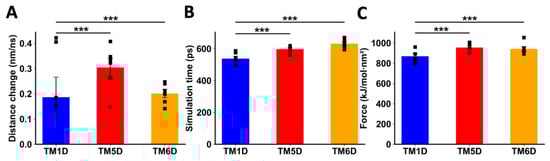 Analysis of non-equilibrium simulation during the pulling away of DRD5 TMs from the whole CCR9 protein. (A) Distance change during simulation at the first part of the method, before the transition point. (B) Simulation time when the transition point is reached. (C) Maximum force reached around transition point. Each symbol represents an individual simulation (n = 6). The mean ± SEM is shown. ***, p < 0.001 via one-way ANOVA followed by Sidak’s multiple comparisons post hoc test.