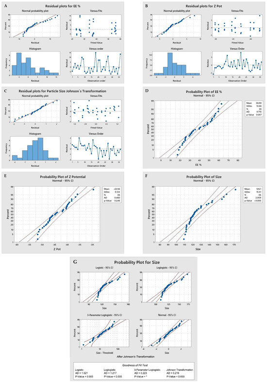 - Normality of residuals and linearity: It is shown when the residuals are aligned to the red line in the upper left box of images A, B, and C. Images D, E, and F show a p-value greater than 0.05, indicating a normal distribution. In the case of the evaluation of the size values, a Johnson transformation was required. Images F and G, for which the transformed data were used in the statistical results, are reported in Table 1;