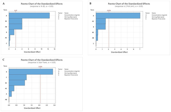 Pareto chart of main effects in DOE. % EE, Z potential and particle size, are represented in (A–C) respectively. Bars that cross the reference line are statistically significant at the 0.05 level with the current model terms. The main effects that are statistically significant (α = 0.05) are those values that exceed the intermittent vertical red line. The null hypothesis is that the coefficient of the term is equal to zero, which implies that there is no association between the term and the response.