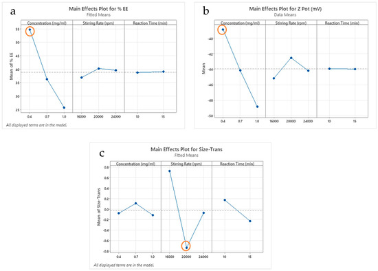 The concentration level of 0.4 mg/mL is statistically significant in that it produces the highest EE%, around 55%. The stirring rate of 20,000 rpm is the main effect for EE%. The reaction time is not statistically significant (Figure 3a). Likewise, the 0.4 mg/mL concentration of CHON is the main effect for Zeta potential, with values around −40 mV.