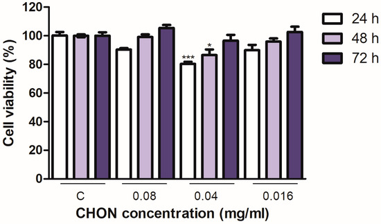 The conditions established in this cell viability study show that no cell cytotoxicity was found at the established concentrations and times; while initial cytotoxicity was observed at 24 h and 48 h after treatment, at 0.04 mg/mL of CHON, the cells recovered quickly and showed almost normal viability at later treatment time points [33].