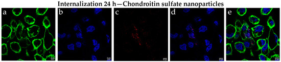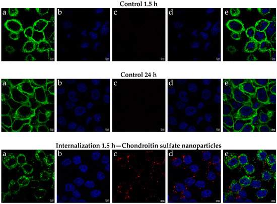 Cellular uptake by confocal microscopy analysis in HaCaT cells. Cells were incubated for 1.5 h and 24 h with the indicated Nile red chondroitin sulfate nanoparticles. (a) Membrane staining with WGA; (b) nuclei staining with DAPI; (c) fluorescence of internalized chondroitin sulfate nanoparticles; (d) merged (b,c), and (e) merged (a–c). The figure scale bar corresponds to 10 μm.