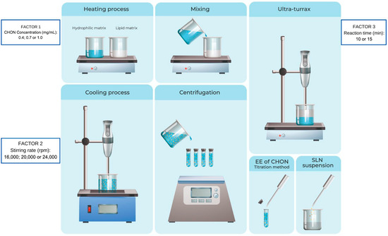 An experimental factorial design was employed to optimize the production of SLN as a CHON vehicle. A 3 × 3 × 2 full-factorial experimental design was used for the optimization of CHON–SLN formulations. The factors tested at various levels (Table 5 and Figure 7) were CHON final concentration (mg/mL) in the formulation, stirring rate during the synthesis reaction, and reaction time, which meant the time during which the synthesis reaction occurred in which it was stirred with the ultraturrax both hot and at 4 °C.