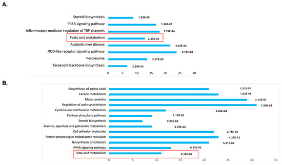 To understand the molecular mechanism of DENSPM action in hPheo1 cells, we performed an RNAseq analysis of gene expression to compare untreated and treated cells. Principal Component Analysis (PCA) demonstrated a complete separation of the treated vs. untreated group (Supplementary Figure S1). The gene list was generated with 2168 downregulated/2827 upregulated genes, and differentially expressed genes were further analyzed against The Database for Annotation, Visualization and Integrated Discovery (DAVID; https://david.ncifcrf.gov; accessed on 11 January 2024) using KEGG pathway analysis (Figure 1A). The gene set was also examined using Gene Set Enrichment Analysis (GSEA, https://www.gsea-msigdb.org/gsea/index.jsp; accessed on 16 January 2024), the Molecular Signatures Database (MSigDB) (Supplementary Figure S2A) and Ingenuity Pathway Studio (Supplementary Figure S3). We noted that the “fatty acid metabolism” gene set is among only three enriched sets (out of total 40) with p-value below <0.01 determined by GSEA (Supplementary Figure S1A). It was also the only gene set identified by both the DAVID and GSEA approaches.