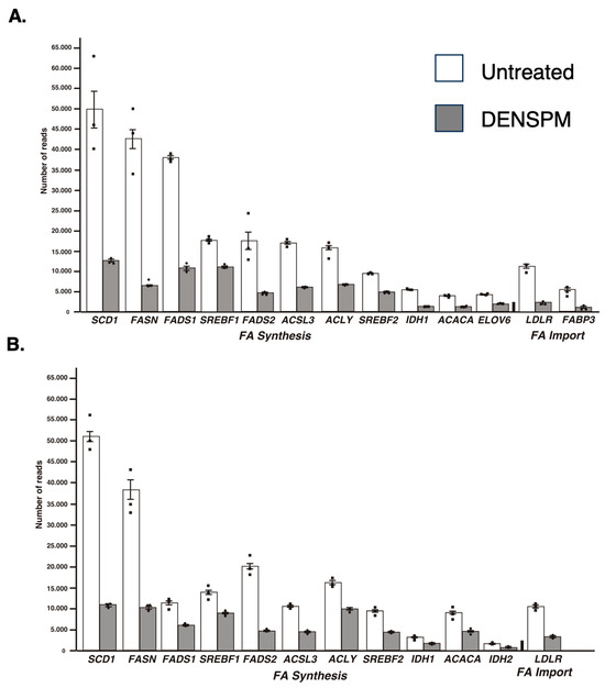 Relative gene expression of lipid-associated genes from the RNA-Seq analysis of hPheo1 (A) and SDHB_KD (B) cells. The means and SEMs for the number of reads corresponding to either untreated (white bars) or DENSPM-treated (grey bars) cells are shown; black squares represent individual observation. All sets are highly significant (p < 0.001).
