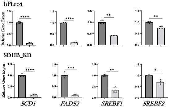 To confirm the results of the RNAseq analysis, we tested the expression of the subset of genes shown in Figure 2 by qRT-PCR. Both hPheo1 and SDHB_KD cells were included in this analysis. To this end, RNA was extracted, cDNA was synthesized, and qPCR was performed. We observed downregulation of lipid-associated gene expression upon DENSPM exposure of all the genes we tested in both cell types (Figure 3 and Table 1). We also confirmed downregulation of an additional gene set associated with lipid metabolism using the RNA from the hPheo1 cells (Supplementary Figure S4 and Supplementary Table S1). In summary, qRT-PCR analysis of the gene expression validated the RNAseq analysis of the changes in the transcriptomes of PCC-derived cells upon DENSPM treatment.