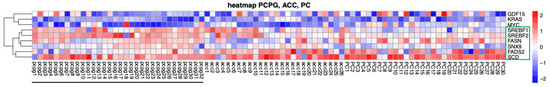 Heatmap of the 9 genes (including 6 genes associated with lipid metabolism, green box) that are differentially expressed between PPGL (underlined), ACC, and Prostate Cancer (PC) tumors. Transcript names are shown along the right axis. Red: increased expression, blue: decreased expression.