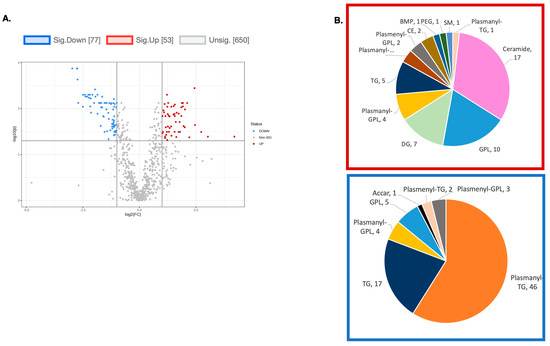 (A) A volcano plot of the LC/MS analysis of lipid composition in untreated vs. 10 µM DENSPM-treated SDHB_KD Cells (Fold change = 2.0; p-value = 0.05, FDR adjusted). (B) A Pie chart shows the significantly altered lipids by (sub)class. Red box: significantly increased lipids by (sub)class. Blue box: significantly decreased lipids by (sub)class. Note that the majority of downregulated lipids belong to the plasmanyl class.