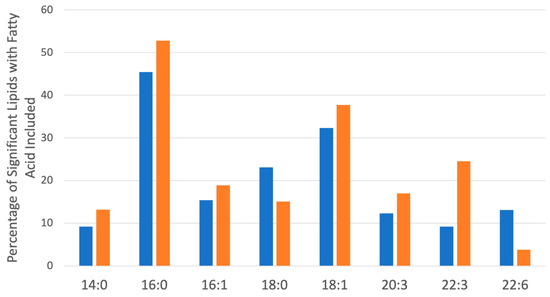 Most common saturated and unsaturated fatty acids within the significantly changed lipids (Figure 6 and Figure 7) in hPheo1 (Orange) and SDHB_KD cells (Blue) treated with DENSPM. Fatty acid classes comprising over 10% of the significant lipids are included. No significant changes between hPheo1 and SDHB_KD cells were noted.