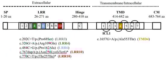 Genetic variants reported in this study in the peptide structure of the TSH receptor (TSHR, NP_000360.2). Five TSHR variants were located in the extracellular loops (LRR1-LRR10) and one in the membrane (TMD4). Colored squares identify the localization of each detected variant. SP: signal peptide; LRR: Leucine Reach Repeats (10 loops); C: C peptide; TMD: transmembrane domain; CM: Cytoplasmic Motifs; L: loop; ICL: intracellular. Underlined: novel variants; *: non-reported in vitro studies. Data from []; TSH Receptor Mutation Database (accessed on 2 August 2023, https://www.tsh-receptor-mutation-database.org/); UniProt (AC P16473; accessed on 2 August 2023, https://www.uniprot.org/uniprotkb/P16473/entry).