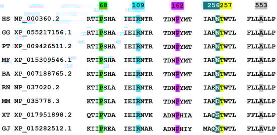 Multiple sequence alignment of the detected TSHR variants with eight species (Clustal Omega, EMBL-EBI). All affected amino acids except Asn256 are well conserved within species. Abbreviation (species/subspecies; name; reference sequence): HS (human; Homo sapiens; NP_000360.2), GG (gorilla; Gorilla gorilla; XP_055217156.1), PT (common chimpanzee; Pan troglodytes; XP_009426511.2), MF (crab-eating macaque; Macaca fascicularis; XP_015309546.1), BA (minke whale; Balaenoptera acutorostrata; XP_007188765.2), RN (brown rat; Rattus norvegicus; NP_037020.2), MM (house mouse; Mus musculus, NP_035778.3), XT (Western clawed frog; Xenopus tropicalis; XP_017951898.2), and GJ (Japanese gecko; Gekko japonicus; XP_015282512.1). Numbers indicate the amino acid position in the peptide sequence.