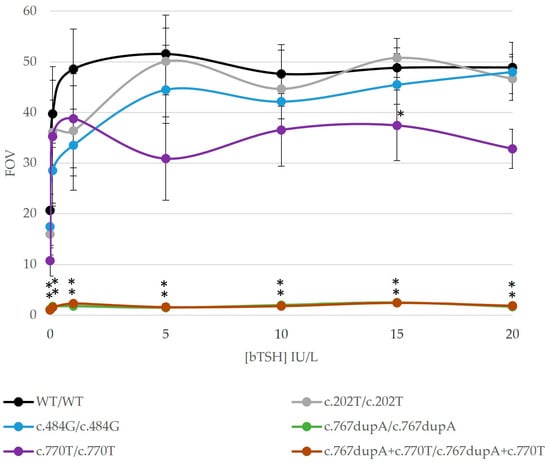 Results of in vitro functional studies of TSHR variants in our cohort. The TSH-dependent activation of Gsα-coupled signal transduction was studied in the detected variants in the homozygosis state. HEK293 cells were transiently transfected with a pGL4.29 (CRE) reporter and a TSHR-wild-type (WT) or a TSHR-mutant plasmid. The results of cells treated with different bovine TSH concentrations (0, 0.1, 1, 5, 10, 15 and 20 IU/L) are shown. Luciferase activity was measured with ONE-Glo™ Luciferase Assay System (Promega). Experiments were performed in duplicate. Results of the WT expression vector are shown in black and the ones from the mutant expression vectors in different colors. Data are shown in comparison with the empty vector values (FOV). The graphic shows impaired functional profiles in all the variants: completely deleterious [c.767dupA/p.(Asn256LysfsTer6)], two partially deleterious [c.484G/p.(Pro162Ala) and c.770T/p.(Thr257Ile)], and one mildly deleterious [c.202T/p.(Pro68Ser)]. Statistical significance was measured with a Student’s t-test (p-value < 0.05). Statistically significant differences with respect to WT are shown with *.