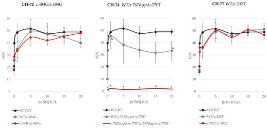 Phenotypes of CH-74 and CH-75 fitted with previous reports of their TSHR variants’ function (c.1657G>A and c.326G>A, respectively) and were not analyzed in vitro. We focused on the profiles in the homozygosis of the remaining TSHR mutants to determine the variant effect on patients CH-72, CH-74, and CH-77 (Figure 3). The TSHR variants in homozygosis showed variable functional profiles: one variant was completely deleterious (c.767dupA), two were partially deleterious (c.484G and c.770T), and one was mildly deleterious (c.202T) according to our results (Figure 2). Variants c.767dupA and c.770T were also analyzed together as they were in cis in our patient (CH-71), showing a completely deleterious profile in cis-homozygosis. Unfortunately, there were almost no statistically significant differences regarding mildly/partially deleterious variants due to high inter-experiment variability. Variant c.767dupA and a combination of variants c.767dupA/c.770T showed statistically significant differences versus WT with all TSH concentrations.