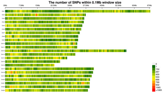A total of 100 genome resequencing libraries were sequenced. We uploaded the raw sequence data to the NCBI database (https://www.ncbi.nlm.nih.gov/, (accessed on 19 August 2024)), with the accession number of PRJNA1144216. After preliminary quality control, an average of 10,556,429,233 bp high-quality data were obtained for each sample. The ratio of high-quality bases (Q score > 30) was 92.48% and the average GC content was 42.45%. By comparing with the reference genome, a total of 3,571,046 SNPs-InDels were obtained. Further quality control filtering was performed, resulting in 2,579,770 high-quality SNPs-InDels. The distribution of high-quality SNPs on 22 chromosomes was shown in Figure 1; the SNP density map showed that density was highest on chr 1 and lowest on chr 15.