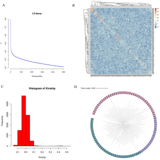 Analysis results of the population structure of experimental subjects. (A) The decay of LD. The horizontal coordinate is the physical distance (kb) and the vertical coordinate is the r2 value. (B) Heat map of phylogenetic relationships between samples. Red means high kinship and blue means low kinship. (C) Frequency distribution map of phylogenetic relationships between samples. The frequency distribution map of kinship shows the main distribution range of the values of kinship relationships between samples. (D) Genotype clustering analysis of experimental subjects. The tree was constructed by the neighbor-joining method, using MEGA X (v7). Evaluate the stability of each node through bootstrap testing with 100 replicates. The scale bar is 0.05.