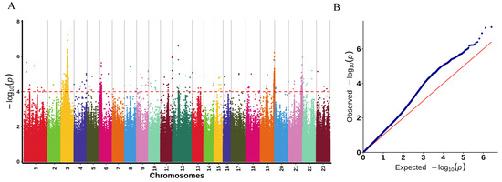 Manhattan plot of association analysis to LMBV resistance in Micropterus salmoides. (A) Manhattan plot constructed for all variant sites. The dotted red line indicates the significance threshold (−log10 p = 4.0). (B) QQ plot of the GWAS. The red diagonal line represents the expected distribution of −log10 (p), where p-values are the probabilities of observing the genetic associations by chance. The blue dots represent the observed −log10 (p) from the GWAS results, which correspond to the actual statistical significance of the genetic variants tested.
