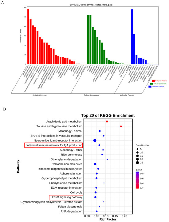 GO/KEGG enrichment analysis of candidate genes. (A) The bar graph of GO items, including biological process, cellular compound, and molecular function. (B) The bubble diagram of the top 20 KEGG pathway. Bubble area size represents the number of genes in the target gene set that belong to this pathway; bubble color represents the q value for the enriches significance. The red box displays the immune-related pathways enriched with candidate genes.