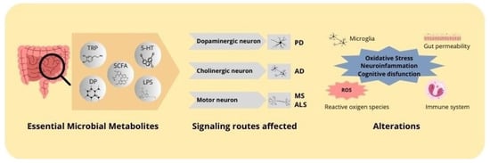 Recent research has provided compelling evidence that gut dysbiosis, defined as an imbalance in the composition and function of the microbiota, contributes to alterations in the production and profile of metabolites, which may play a role in the pathogenesis and progression of neurodegenerative diseases [13,18]. For example, in AD, it has been observed that certain microbiota-derived metabolites can promote the formation of amyloid plaques and exacerbate neuroinflammation [19]. In PD, the altered production of SCFAs and tryptophan metabolites can influence the death of dopaminergic neurons and the appearance of motor and neuropsychiatric symptoms [20]. Likewise, in MS, dysbiosis can modulate the immune response through changes in microbial metabolites, affecting demyelination and chronic inflammation [21].