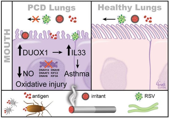 - Gaston, B.; Smith, L.A.; Davis, M.D.; Saunders, J.; Daniels, I.; Horani, A.; Brody, S.L.; Giddings, O.; Zhao, Y.; Marozkina, N. Antigen stasis and airway nitrosative stress in human primary ciliary dyskinesia. Am. J. Physiol. Lung Cell. Mol. Physiol. 2024, 326, L468–L476. [Google Scholar] [CrossRef]