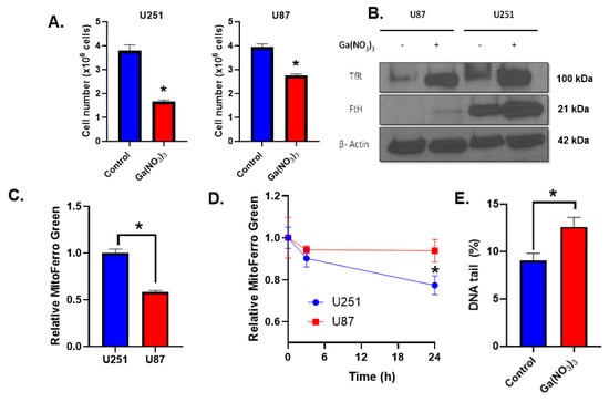Ga(NO3)3 causes mitochondrial iron depletion associated with DNA damage induction. (A) Cell counts in U251 and U87 GBM cells following a 48 h, 500 µM Ga(NO3)3 treatment. Error bars represent mean ± SD of three measures with * p < 0.05 using Welch’s t-test. (B) Western blot analysis of transferrin receptor (TfR) and ferritin heavy chain (FtH) expression following a 24 h, 500 µM Ga(NO3)3 treatment. β-actin is used as a loading control. (C) Baseline mitochondrial iron content in U251 and U87 GBM cells (normalized to U251 cells). Error bars represent mean ± SD of three measures with * p < 0.05 using Welch’s t-test. (D) Temporal effects of 500 µM Ga(NO3)3 on mitochondrial iron content measured at 3 and 24 h. Error bars represent mean ± SD of three measures with * p < 0.05 using a two-way ANOVA test. (E) Single-stranded DNA damage analyzed using an alkaline comet assay in U251 cells following a 24 h treatment of Ga(NO3)3. Error bars represent mean ± SD of three measures with * p < 0.05 using Welch’s t-test.