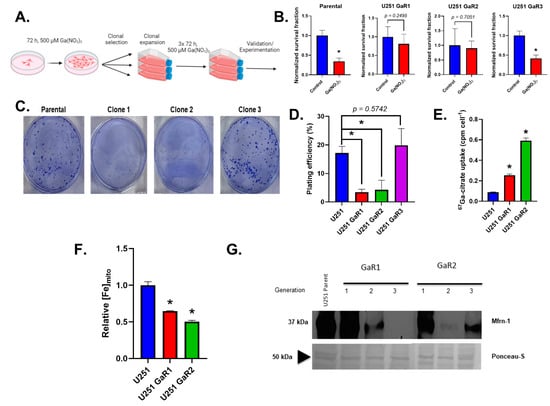 Gallium-resistant cells are highly unstable and have impaired mitochondrial iron uptake. (A) Gallium-resistant U251 cell lines were generated via three separate clonal selections following a 72 h, 500 µM treatment of Ga(NO3)3 for generating stable cell lines. (B) Ga(NO3)3 resistance was confirmed using a clonogenic survival assay with three separate clonally selected cell lines (GaR1,2,3) and parental U251 cells being treated with a 500 µM treatment of Ga(NO3)3 for 72 h. Error bars represent mean ± SEM (n = 3) with * p < 0.05 using Welch’s t-test. (C,D) Clonally selected cell lines (GaR1,2,3) with confirmed resistance to Ga(NO3)3 exhibit noticeable decreases in colony formation when plated as single cells (500 cells, C). This translates to a significant decrease in plating efficiency where plating efficiency (%) = # colonies counted/# cells plated (D). To combat this experimental difference, GaR1/2 were plated at higher concentrations (1000–2000 cells) for subsequent studies. Error bars represent mean ± SEM (n = 3) with * p < 0.05 using a one-way ANOVA with a post hoc Tukey’s test for multiple comparisons. (E) Parental U251, GaR1, and GaR2 cells were incubated with 200 µCi 67Ga-citrate for 2 h prior to harvesting, lysing, and analysis with a gamma counter to evaluate gallium uptake. (F) Analysis of basal mitochondrial iron content using MitoFerroGreen flow cytometry in Parental U251, GaR1, and GaR2 cells. Error bars represent mean ± SEM (n = 3) with * p < 0.05 using a one-way ANOVA with a post hoc Tukey’s test for multiple comparisons. (G) Western blot analysis of mitoferrin-1 expression (Mfrn-1) in the 3 separate generations of GaR1 and GaR2 cells following each individual round of clonal selection compared to parental U251 cells show an evolutionary loss of Mfrn-1.