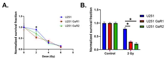 Mitochondrial iron metabolism modulates cell radiosensitivity. (A) Clonogenic survival analysis of radiation dose-dependent cell killing in parental U251, GaR1, and GaR2 cell lines. (B) Clonogenic survival analysis of U251, GaR1, and GaR2 cell lines treated with 2 Gy radiation and left for 24 h prior to plating. Error bars represent mean ± SEM (n = 3) with * p < 0.05 using a two-way ANOVA test with a post hoc test for multiple comparisons.