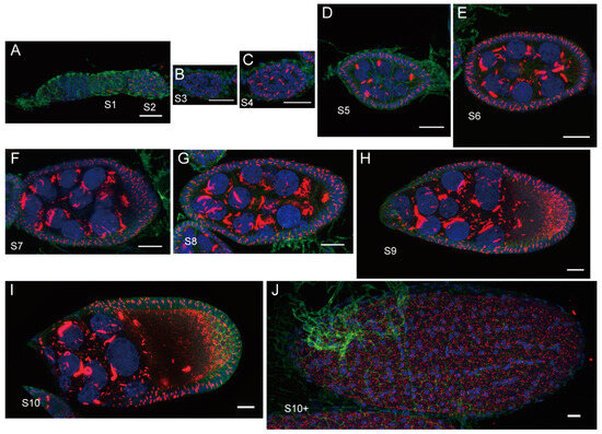 Schematic representation of cytoophidia formation at the stages of Drosophila oogenesis. (A–J) Red represents mCherry-tagged CTPS, green for cell membranes, and blue for nuclei. S: stages. Scale bars: 20 μm.