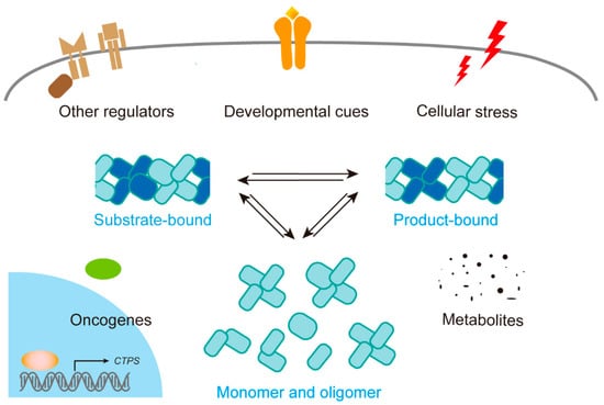 Enzymatic polymerization refers to a novel mechanism of enzyme kinetics regulation, which may integrate metabolic signaling pathways and play its unique role in nutritional stress, growth, and development. Four NTPs directly bind and control CTPS activity [16]. In bacteria, the inactive E. coli CTPS dimers oligomerize into an active tetrameric form with the supplement of substrates UTP and ATP [75]. ATP facilitates the UTP-dependent tetramerization of CTPS, while its product CTP inhibits enzyme activity and prompts shifting into an inactive tetrameric state in S. cerevisiae [76]. GTP stimulates the reaction at low concentrations but inhibits it at higher levels [77].