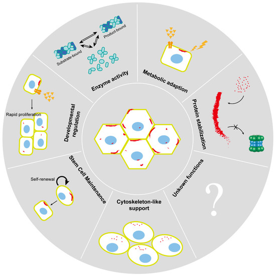 Characterizing cytoophidia involves a multifaceted approach, integrating microscopy, genetic manipulation, biochemical assays, and live-cell imaging. Notably, cytoophidia play crucial roles in various cellular processes, including regulating enzyme activity, facilitating metabolic adaptation, contributing to developmental regulation, maintaining stem cell function, providing cytoskeleton-like support, and stabilizing proteins (Figure 3).