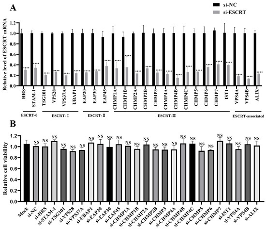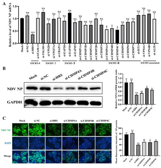 2.1. Identification of Key ESCRT Subunits Regulating NDV Replication in HeLa Cells