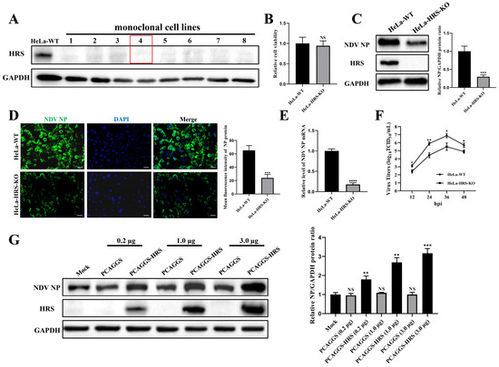 2.2. HRS Positively Regulates NDV Replication in HeLa Cells