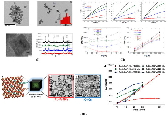| Fe3O4 and γ-Fe2O3 | Thermal decomposition | 18/Octahedral 22/Truncated octahedral | 124 320 | 3.06 × 109 | The particles exhibited superparamagnetic behavior at room temperature. The predominant magnetic relaxation phenomena consisted of Neel processes. Higher SAR values were obtained compared to other synthesis routes. | [89] |