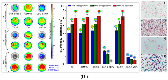 | Fe3O4 cationic liposomes (TMAG, DLPC, DOPE (1:2:2)/100 μg/mL | T-9 cell pellets | 35 nm | 383.72 Oe/118 kHz | - | 42 °C | MHT combined with an innovative vaccination therapy | [132] |