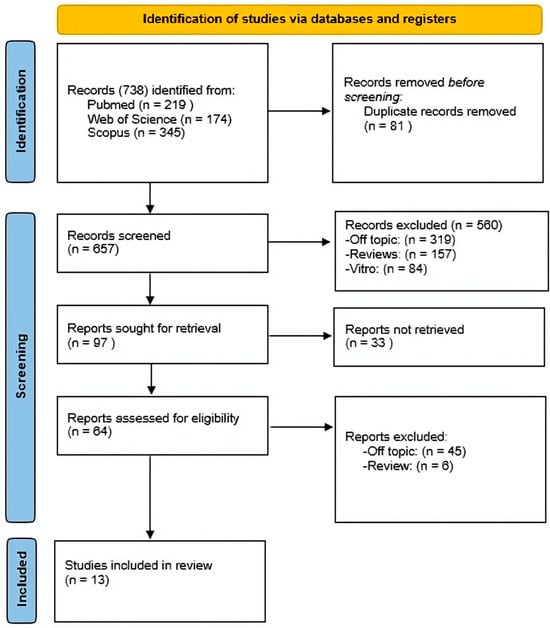 After removing duplicates (n = 81), the titles and abstracts of 657 papers were assessed to filter them. A total of 97 records that did not match the inclusion criteria were identified (319 off-topic, 157 reviews, 84 vitro experiments), leaving us with 560 papers. Following the removal of 33 records that could not be retrieved, another 50 reports were removed for not meeting the inclusion criteria (45off-topic, 6 reviews). A further 13 articles were reviewed in the quality analysis.