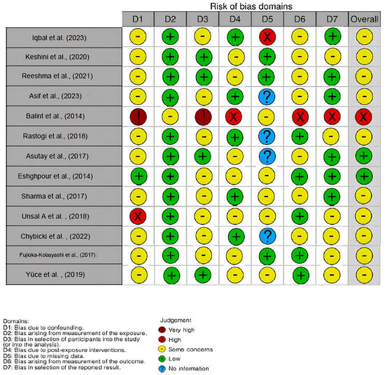 The risk of bias in the included studies is reported in Figure 2. Most of the studies exhibit some issues regarding bias due to confounding data. Measuring the exposure generally has a low risk of bias. Many studies also display a low risk of bias in the selection of participants. The bias due to missing data presents mostly some concerns. The bias arising from the measurement of the outcome is primarily low. The bias in the selection of the reported results mainly raises some concerns. The final results indicate that out of fourteen analyzed articles, three studies have a low risk of bias, ten studies have some issues, and one study has a high risk of bias.
