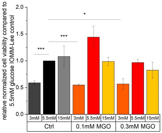Cell viability of IOMM-Lee cell line in different glucose levels with and without MGO. MTT cell viability assay was performed after 24 h treatment with different glucose concentrations (3 mM, 5.5 mM and 15 mM) with or without MGO (0.1 mM, 0.3 mM). Graph shows relative cell viability of IOMM-Lee cell line treated with different glucose concentrations with or without MGO (0.1 mM, 0.3 mM), normalized to 5.5 mM glucose. Statistical analysis was performed using t-test and error bars represent SD (n = 3, p < 0.05 = *, p < 0.005 = ***).